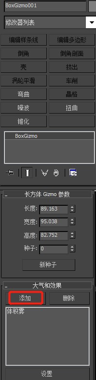 2、構畫后,點擊其框體,在修改中可以對其進行參數修改;然后修改列表下方有“大氣與效果”,點擊“添加”一欄,選擇“體積霧”;