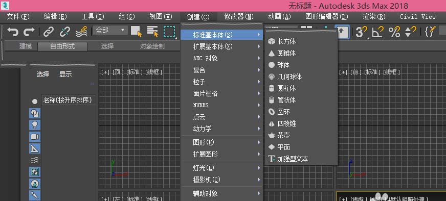 3、從最上面的主菜單欄中來找到插入選項,打開插入選項就可以看到標準基本體,我們要介紹的茶壺就在標準基本體中,如圖