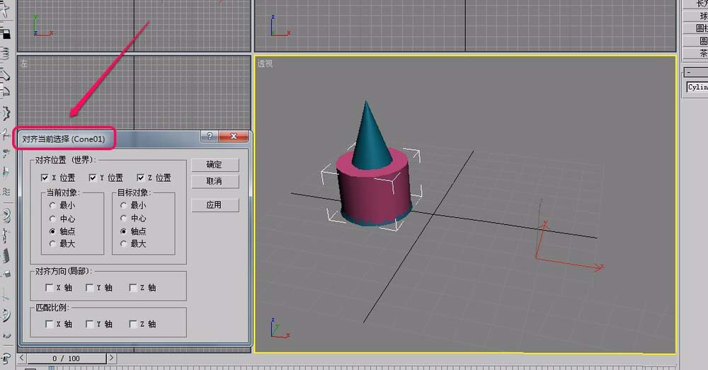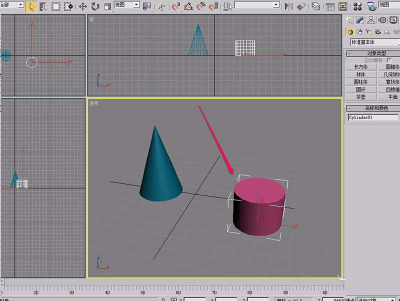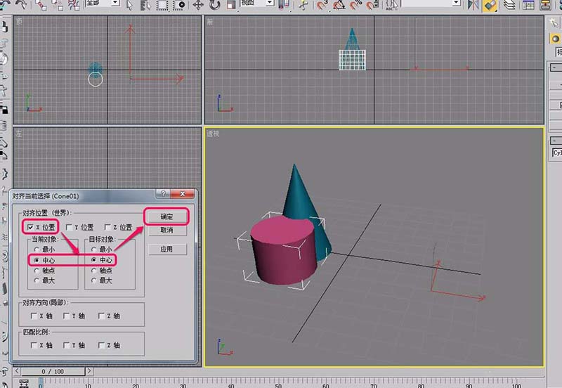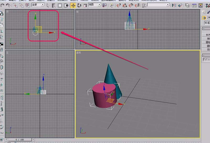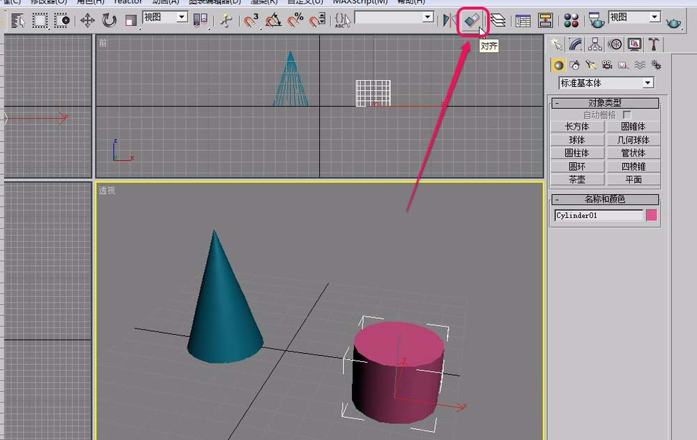 7、最后圓柱體和圓錐體的對其效果如圖。在“頂視圖”中,2個物體的對齊效果較清晰。