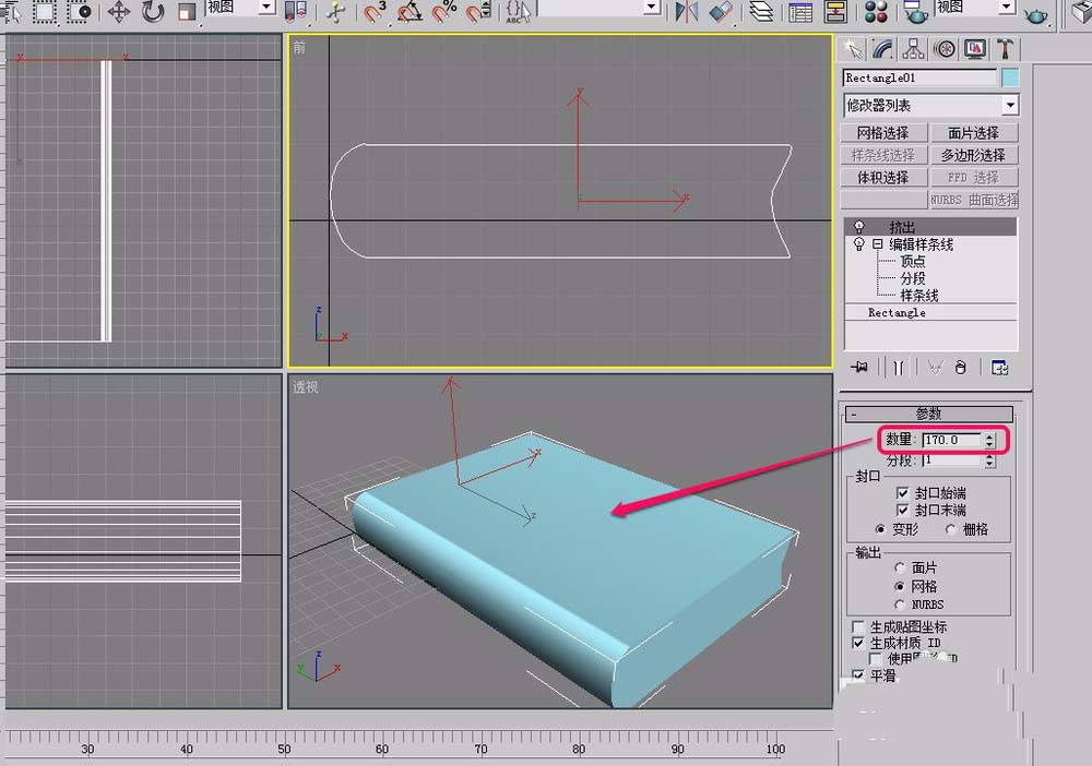 8、現(xiàn)在,我們打開“參數(shù)”卷展欄,將“數(shù)量”設(shè)置為 170.0 ,這樣,書本在長度方面變長了,看起來更像一本書。