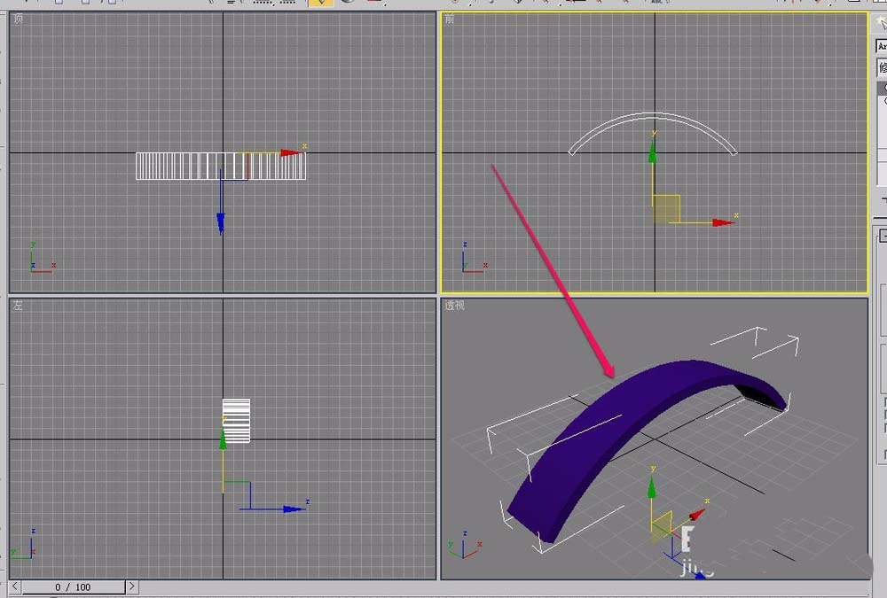 1、打開3dsmax軟件,在“前”視圖中繪制一段弧。