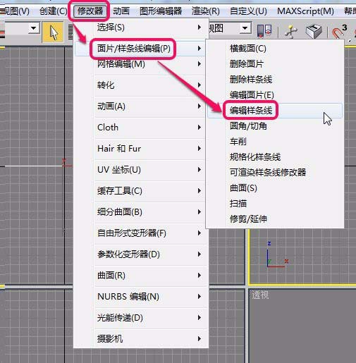 2、打開“修改器”菜單,選擇“面片/樣條線編輯”項中的“編輯樣條線”命令。