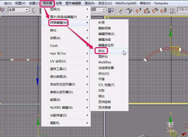 6、打開“修改器”菜單,選擇“網格編輯”項中的“擠出”命令。