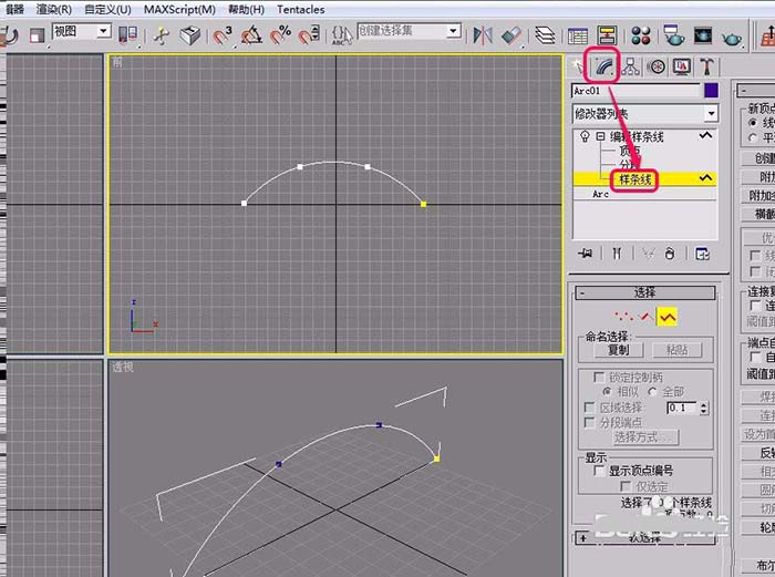3、打開“修改”選項卡,選擇“編輯樣條線”修改器中的“樣條線”層級。