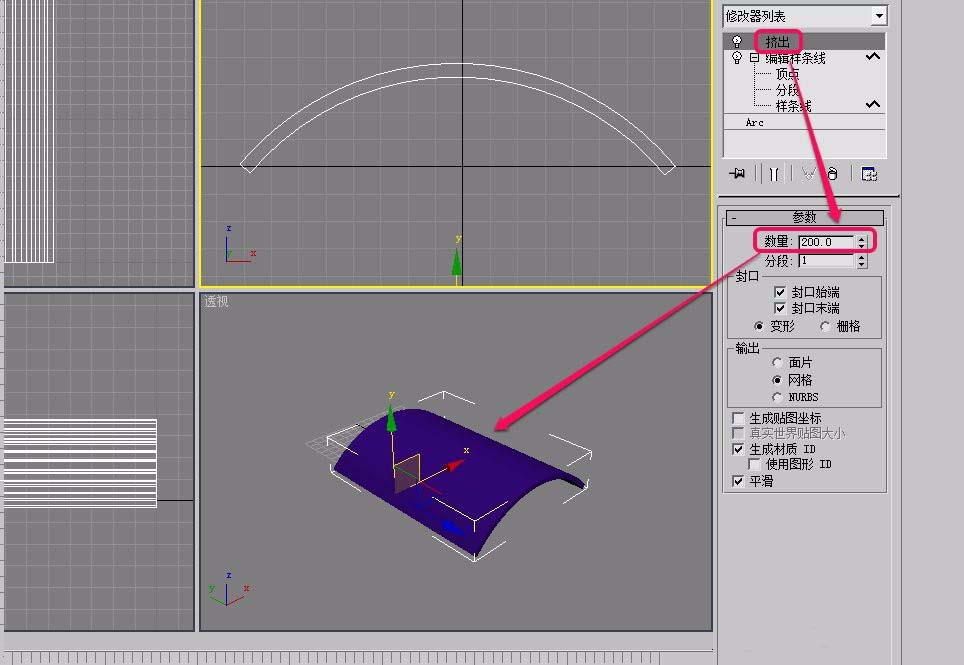 8、在“擠出”修改器中,打開“參數”卷展欄,將“數量”設置為 200.0。這時,瓦片就比較好看了。
