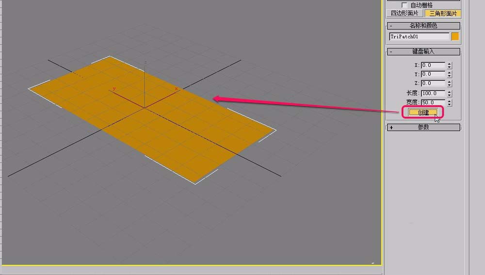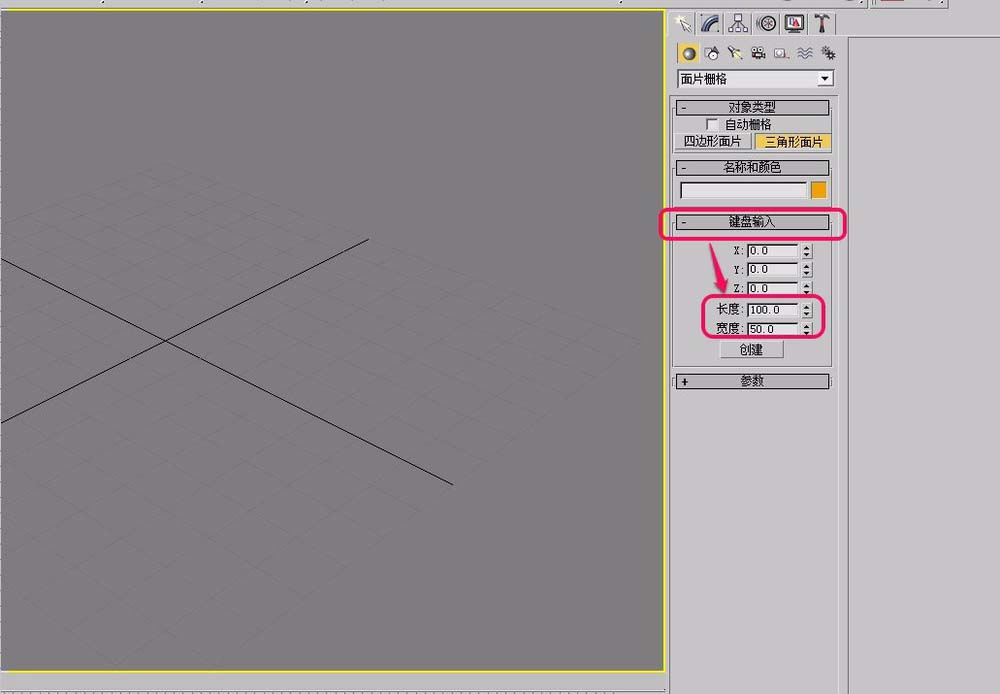 6、還可以打開“鍵盤輸入”卷展欄,手動輸入“長度”和“寬度”數值。單擊“創建”按鈕,創建出三角形面片。