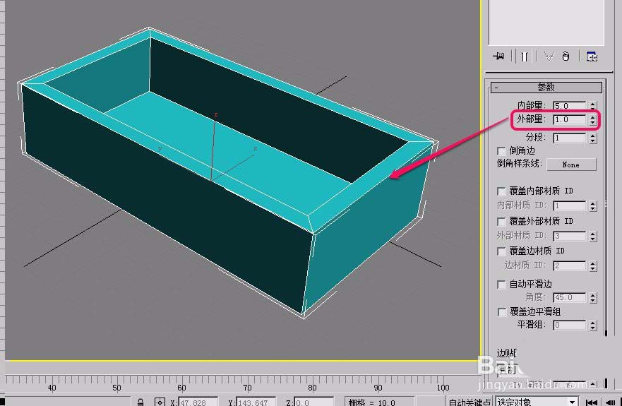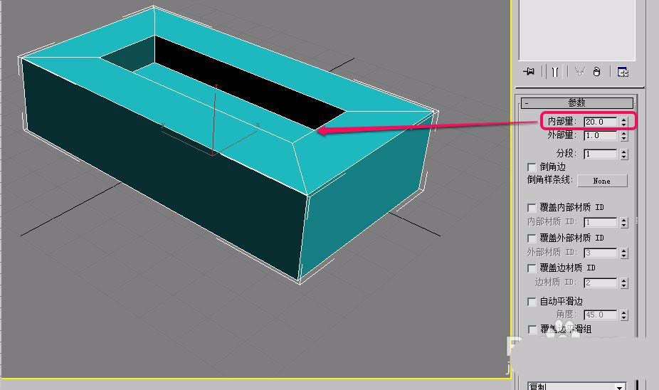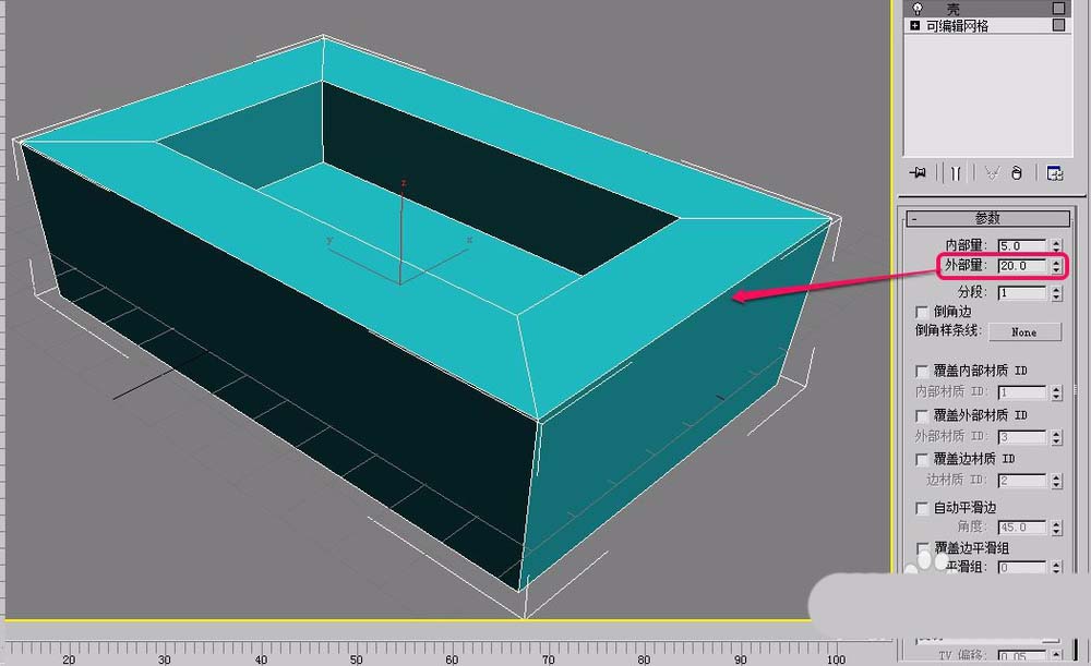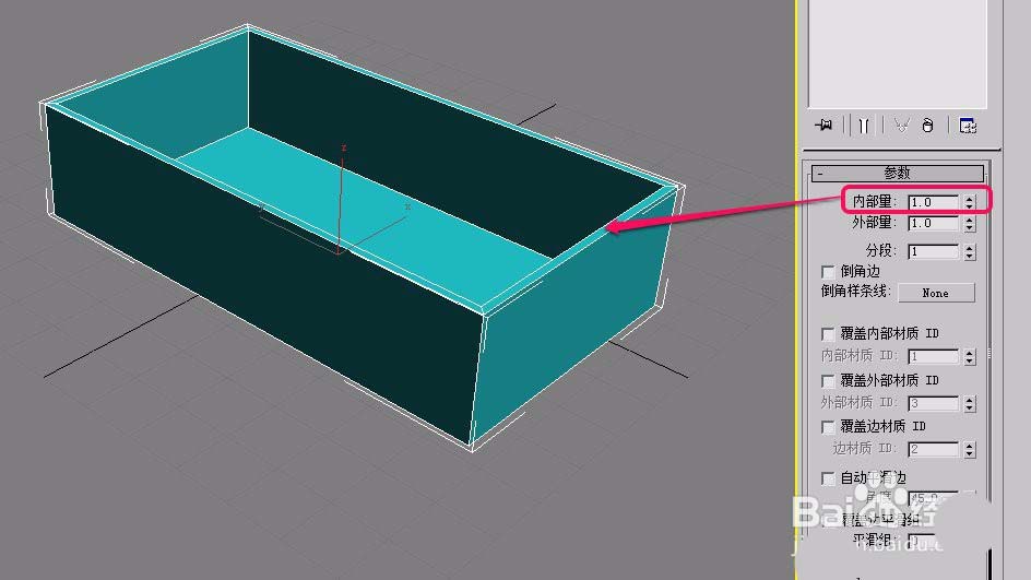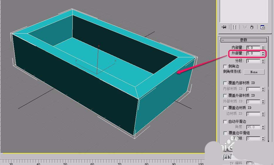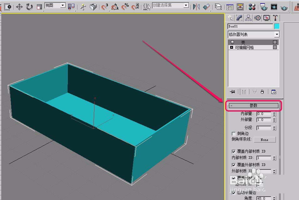 1、打開3ds max軟件,創建一個應用了“殼”變形器的長方體(長方體上表面已經去掉)。