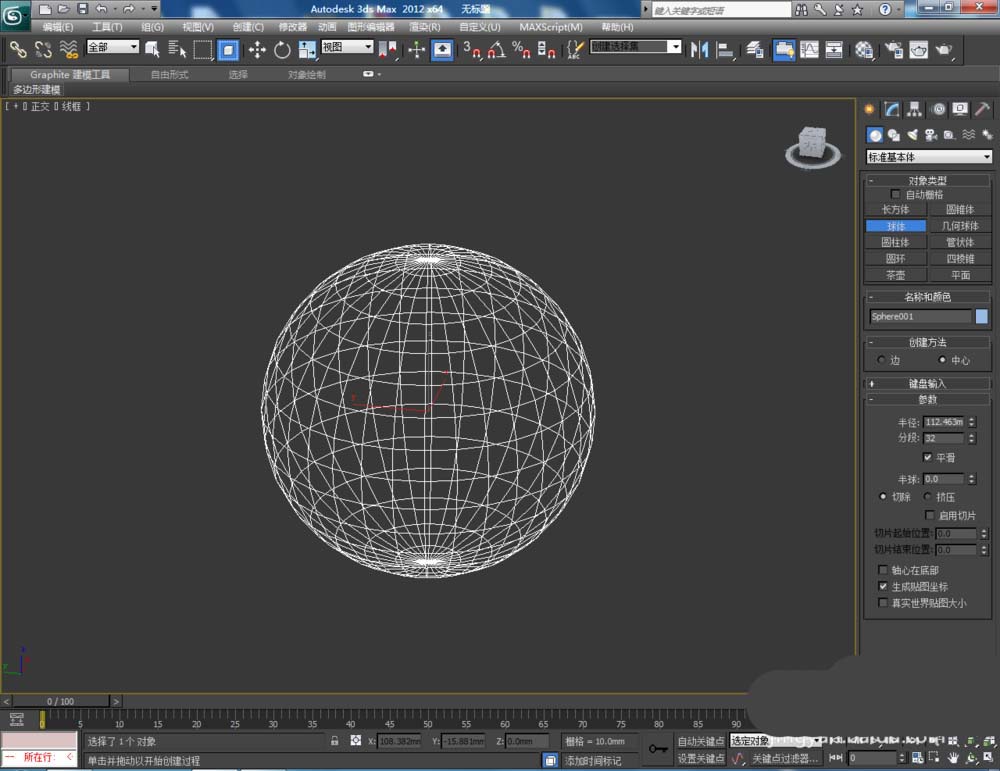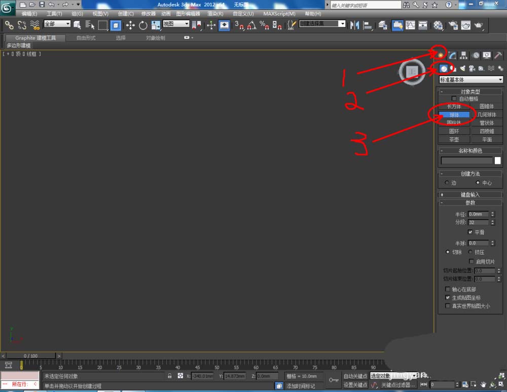 1、打開3Dmax2012軟件,點擊【創建】-【幾何體】-【球體】,在作圖區域繪制一個球體模型。按圖示設置好球體參數后,將對象顏色設置為白色(如圖所示);