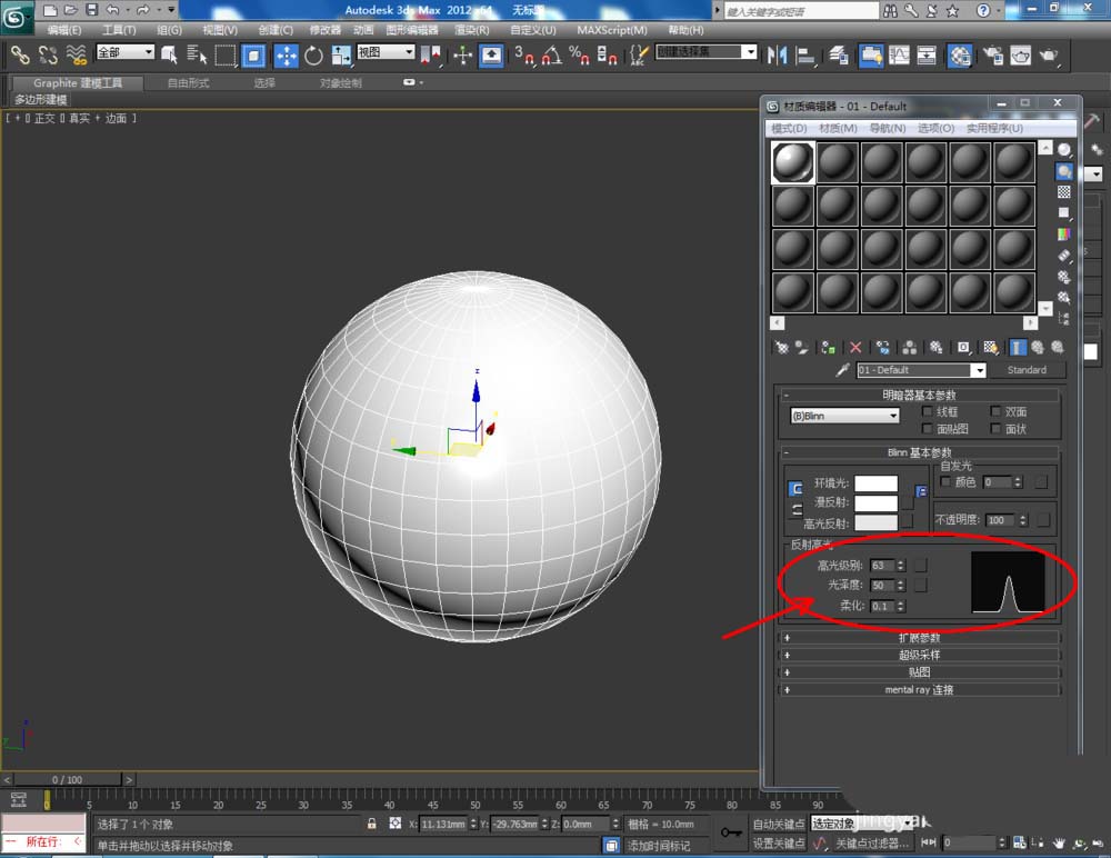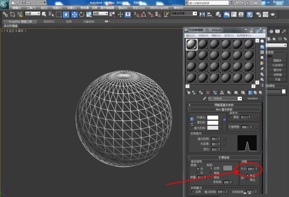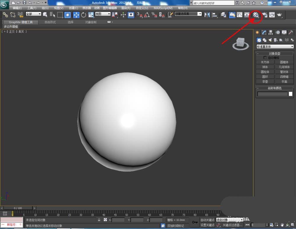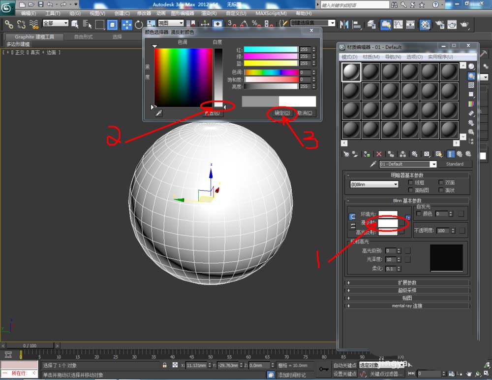 2、點擊【材質編輯器】,彈出材質編輯器設置欄,按圖示參數設置一個白色材質球。選中球體模型,將白色材質球附加給模型(如圖所示);