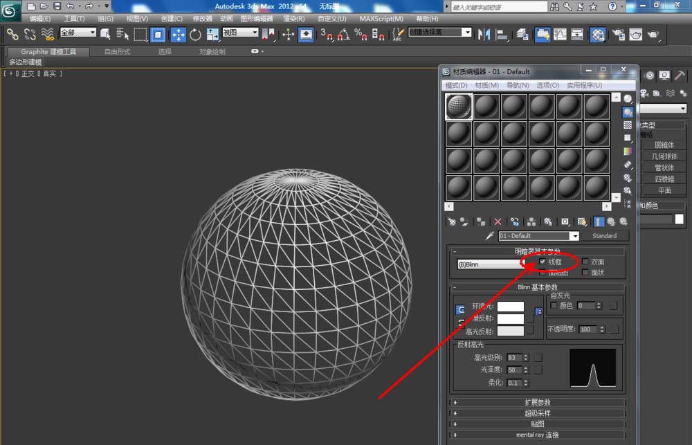 3、點擊【材質編輯器】,將白色材質球中的【線框】和【雙面】勾選,點擊下方的【擴展參數】,設置好線框的參數大小后,點擊渲染,制作出線框球體模型(如圖所示);