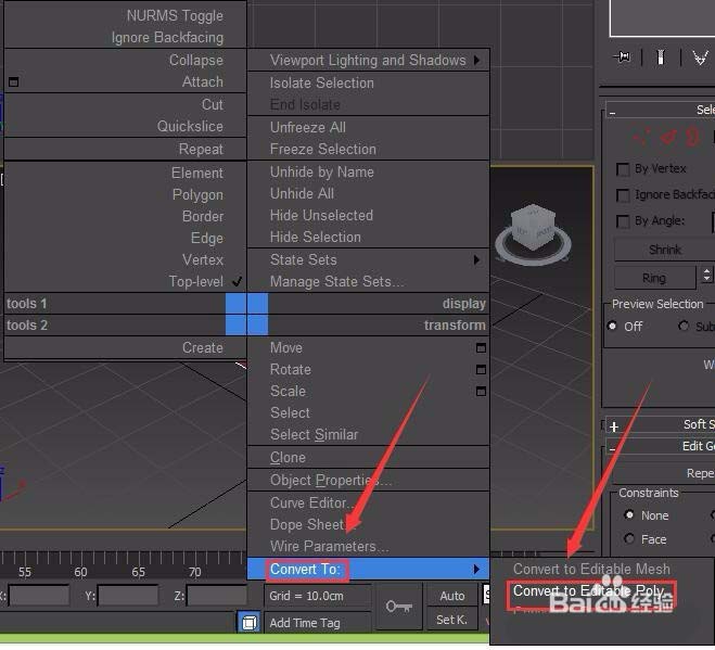 5、參數調節完成以后,在該物體上單擊鼠標右鍵在彈出的右鍵菜單里找到convert to選項,點擊convert to選項在其下拉菜單里找到covert to editable poly選項,如圖所示: