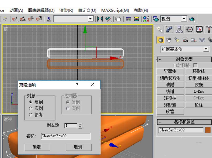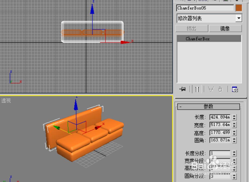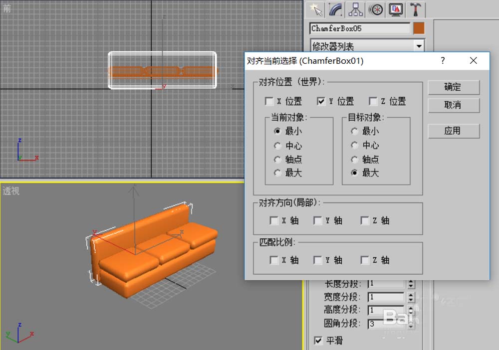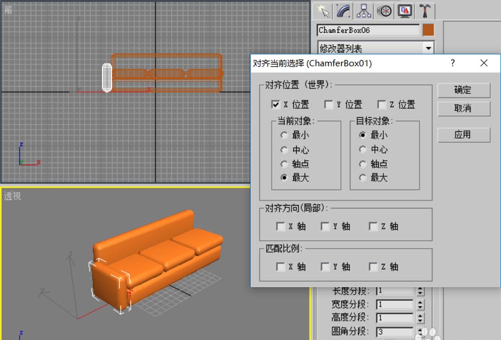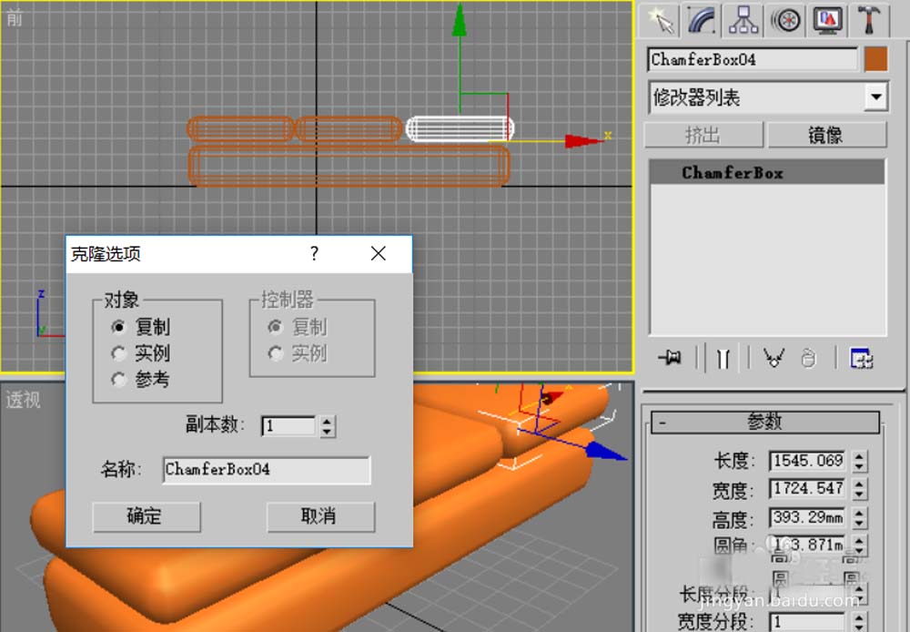 9、選擇剛創建的長方體,向右移動復制一份,并與大長方體對齊。至此,沙發模型創建完成。