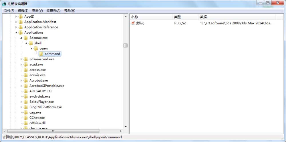 2)找到command選項,會看到右側欄有"錯誤"的3DMAX主文件啟動路徑"E:/art.software/3ds 2009/3ds Max 2014/3dsmax.exe" "%1"(我的里面的數據是2009版本);