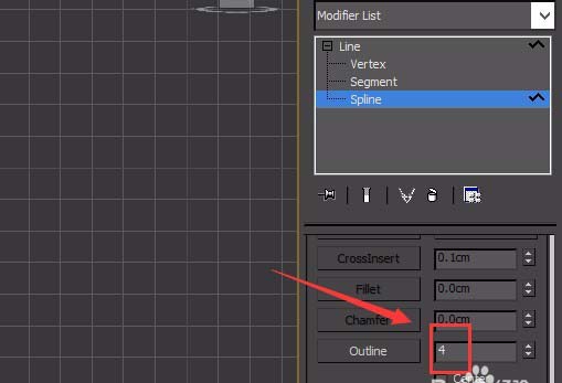 7、選擇繪制的曲線,進(jìn)入其spline層級,在modify里找到outline選項(xiàng),設(shè)置outline的值為4,如圖所示: