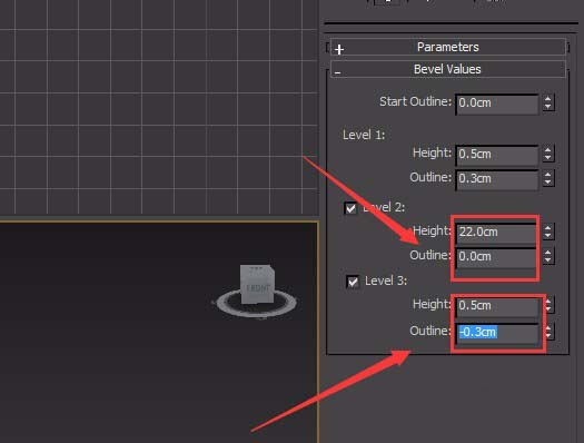 8、選擇這個(gè)添加輪廓線的線形,給其添加一個(gè)bevel修改器,其參數(shù)調(diào)節(jié)如圖所示: