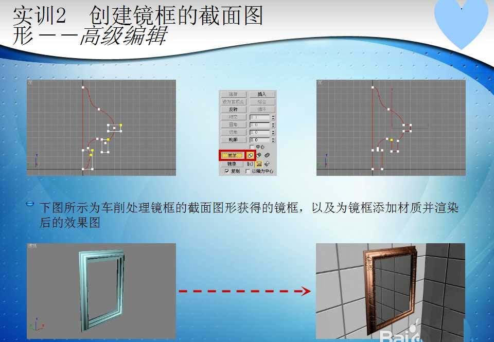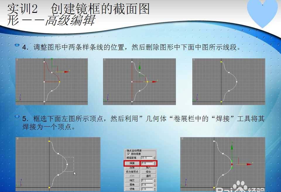 掌握合并圖形的方法。掌握對(duì)樣條線進(jìn)行鏡像處理的方法。掌握對(duì)樣條線進(jìn)行布爾處理的方法。掌握連接頂點(diǎn)的方法。掌握焊接頂點(diǎn)的方法。