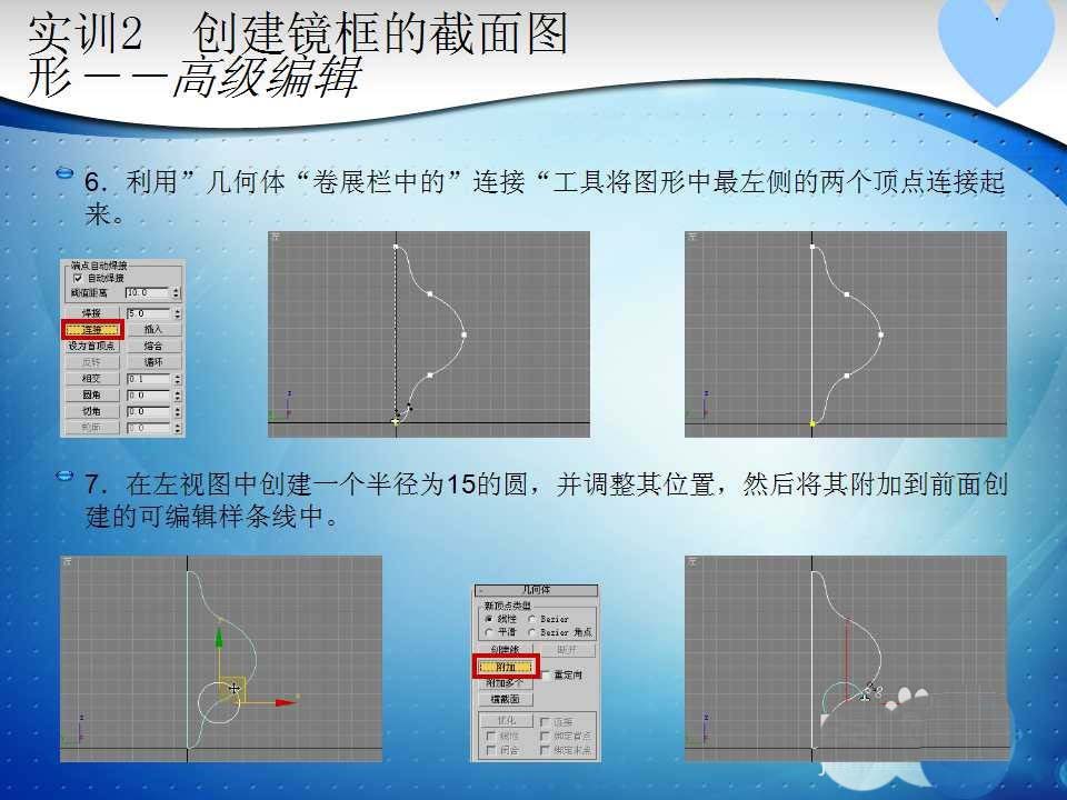 4、利用”幾何體“卷展欄中的”連接“工具將圖形中最左側(cè)的兩個(gè)頂點(diǎn)連接起來(lái)。在左視圖中創(chuàng)建一個(gè)半徑為15的圓,并調(diào)整其位置,然后將其附加到前面創(chuàng)建的可編輯樣條線中。