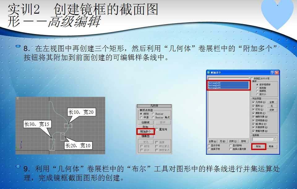 5、在左視圖中再創(chuàng)建三個(gè)矩形,然后利用“幾何體”卷展欄中的“附加多個(gè)”按鈕將其附加到前面創(chuàng)建的可編輯樣條線中。利用“幾何體”卷展欄中的“布爾”工具對(duì)圖形中的樣條線進(jìn)行并集運(yùn)算處理,完成鏡框截面圖形的創(chuàng)建。