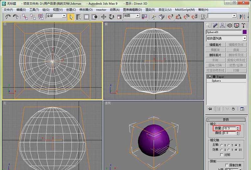 4、在錐化修改器下的卷展欄中,設置數(shù)量為-0.3。大家可以用一些數(shù)字調一下看一下效果。