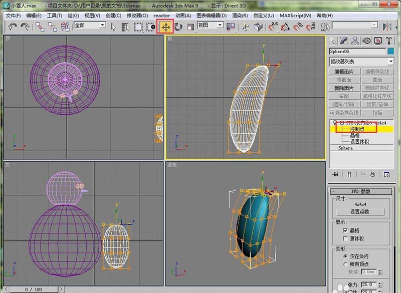 12、然后選擇FFD長方體下的控制點,用移動工具將這個壓扁的球體有一定的傾斜度。