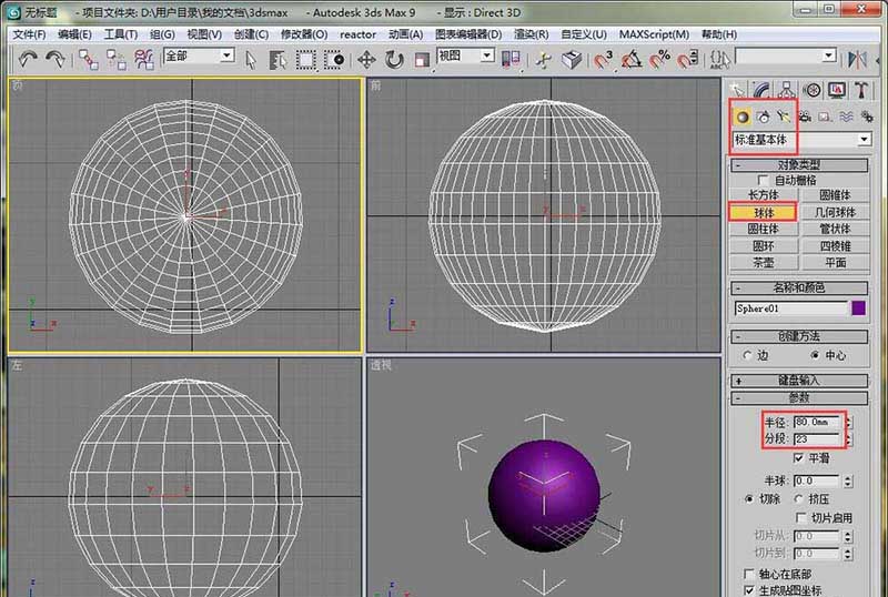 2、身體部分。在頂視圖中畫一個球體,半徑設置為80,分段設置為23.