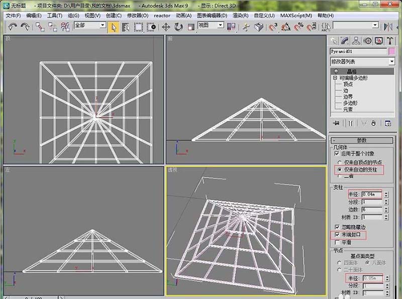 5、然后給四棱錐加載一個晶格修改器。設置好參數(shù)