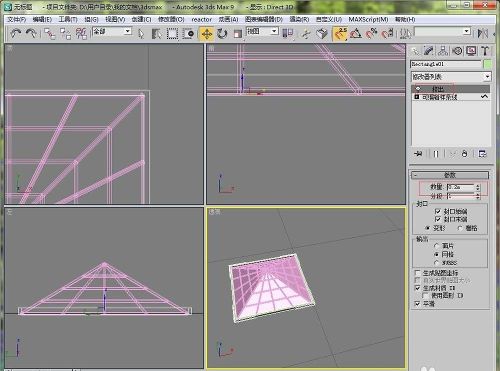 9、然后加載擠出修改器,設置一個擠出數(shù)量。這樣就做好了頂部