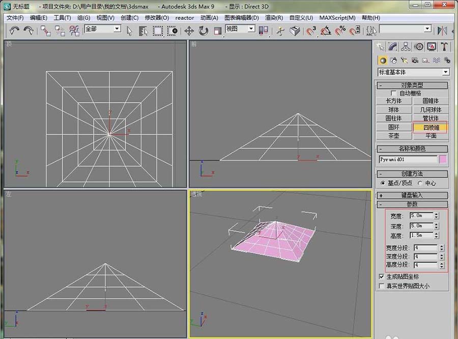 2、在創(chuàng)建基本體里選擇創(chuàng)建四棱錐。大小自己定,分段可以設置3段或4段。