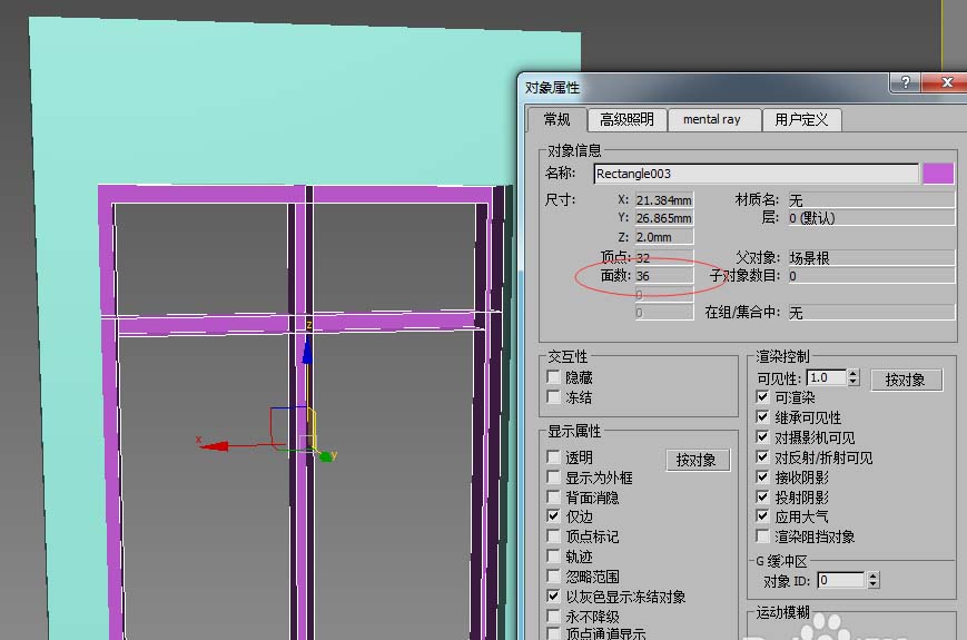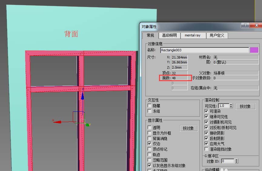 3、窗框選擇的紅色面在正面渲染的時候是看不到的,沒刪除之前為48個面,刪除后為32個面,渲染正面是不影響渲染結果的。