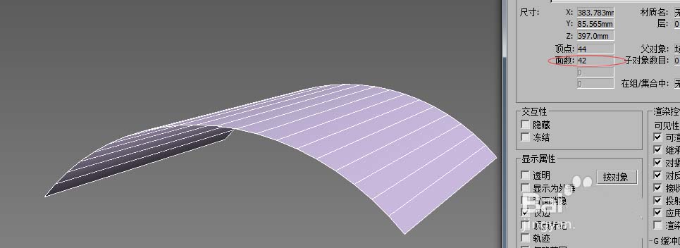 1、比如這里我以圓弧二維線為例,然后添加一個擠出修改器,可以看到物體有42個面。