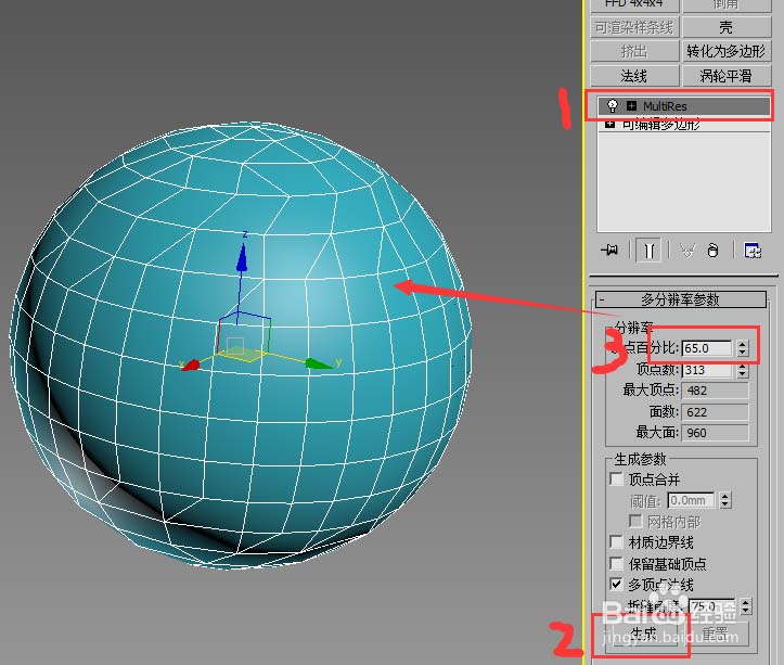 1、以球體為例,轉化為編輯多邊形,然后添加multres命令,點擊下方的生成,改變一定量的球體點數,渲染結果是一樣,達到減面的效果。