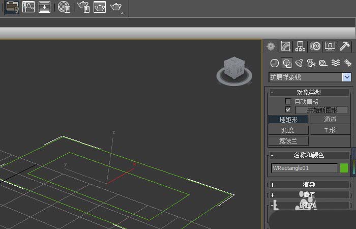 2、在【擴展樣條線】的面板上,鼠標左鍵單擊【擴展樣條線】下的(墻矩線),接著在透視圖中,拖動繪制一根墻矩線出來,如下圖所示。