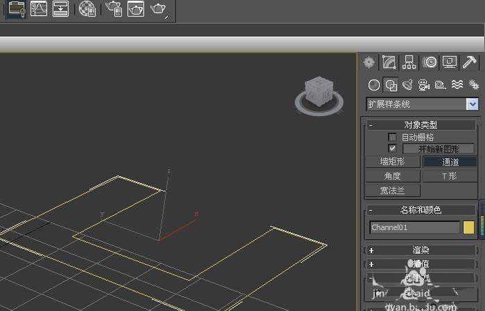 3、在【擴展樣條線】的面板上,鼠標左鍵單擊【擴展樣條線】下的(通道線),接著在透視圖中,拖動繪制一根通道線出來,如下圖所示。