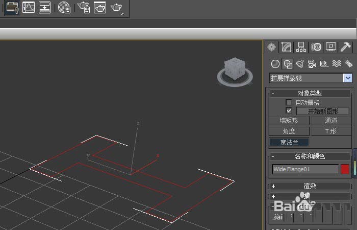 6、在【擴展樣條線】的面板上,鼠標左鍵單擊【擴展樣條線】下的(寬法蘭線),接著在透視圖中,拖動繪制一根寬法蘭線出來,如下圖所示。