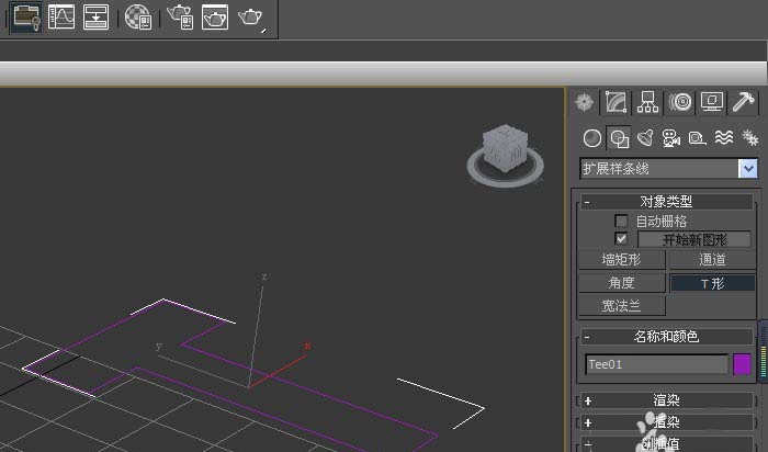 5、在【擴展樣條線】的面板上,鼠標左鍵單擊【擴展樣條線】下的(T型線),接著在透視圖中,拖動繪制一根T型線出來,如下圖所示。