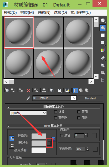 5、點擊材質(zhì)編輯器選項,在彈出的對話框內(nèi)選擇一個材質(zhì)球,并找到漫反射后的選擇框,如圖所示;