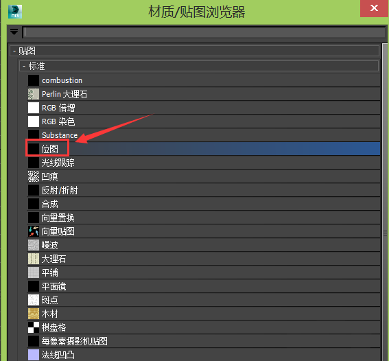 8、點擊貼圖選擇框在彈出的對話框內(nèi)選擇位圖選項,點擊位圖選項,在彈出的打開貼圖對話框內(nèi)找到我們的貼圖,如圖所示: