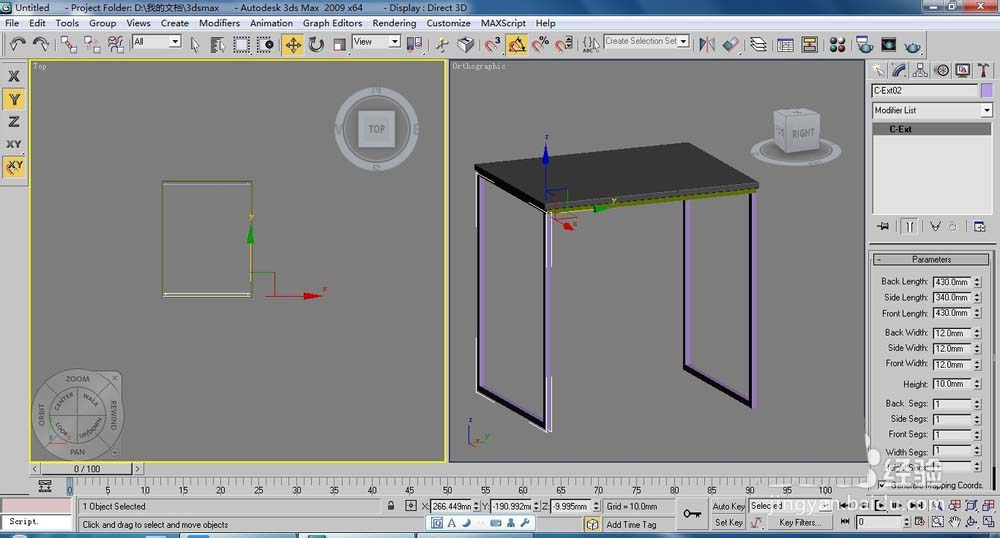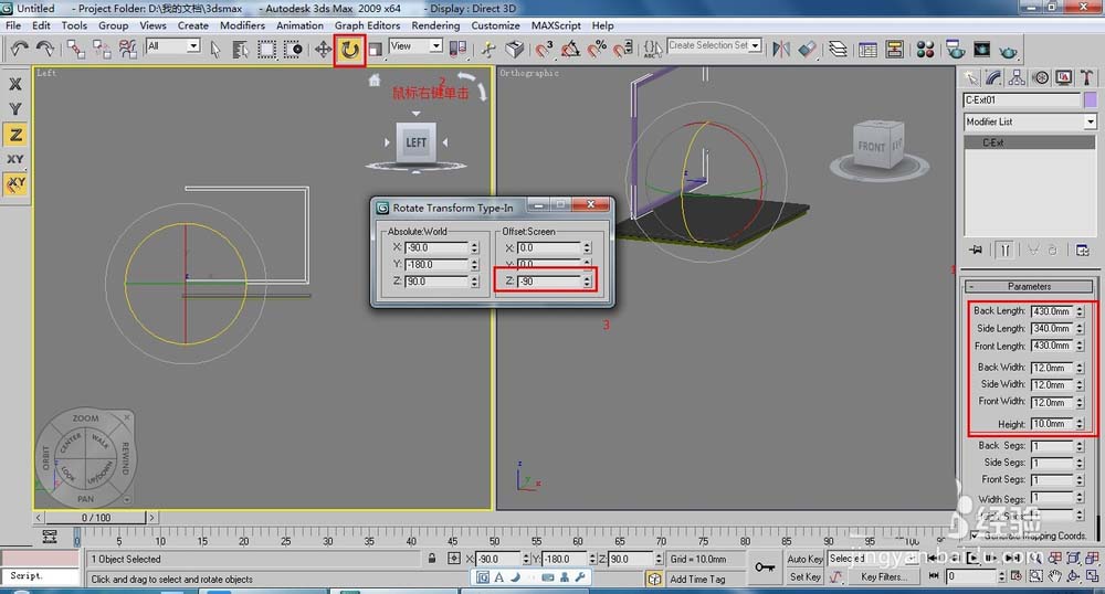 3、單擊(創(chuàng)建)/(幾何體)/C-Ext(C形拉伸體)按鈕,在左視圖中單擊并拖動(dòng)鼠標(biāo)創(chuàng)建一個(gè)C-Ext。進(jìn)入修改命令面板,修改各項(xiàng)參數(shù),沿Z軸旋轉(zhuǎn)-90度,如圖。