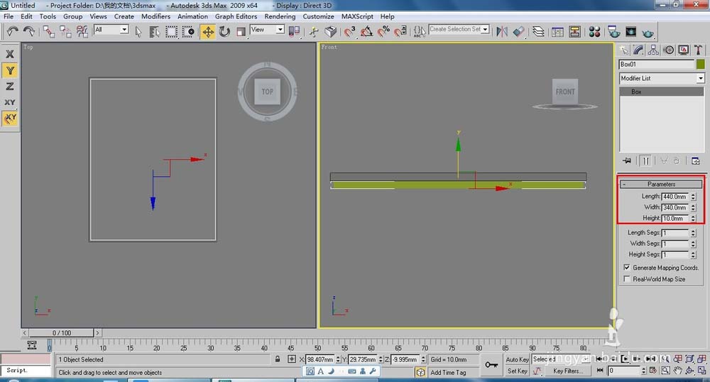 2、在頂視圖中創(chuàng)建一個(gè)340*440*10的長(zhǎng)方體,作為套幾的”支架“,形態(tài)及參數(shù)如圖。