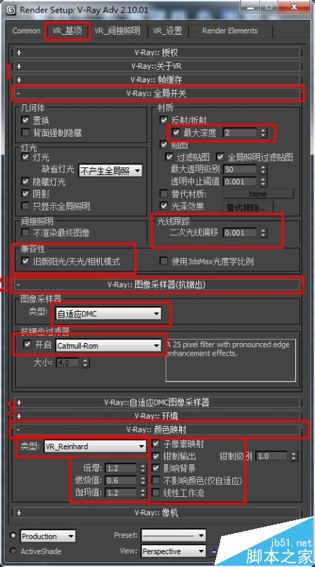 5、接下來項目就比較多了,VR基項里邊需要設置三個卷展欄,圖上已經給標上數字步驟,一定要對應好了紅色線框里的內容