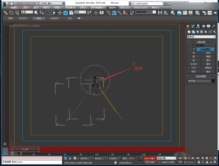 9、進(jìn)入前視圖,打開自動(dòng)關(guān)鍵點(diǎn),將進(jìn)度條拖到第四幀,利用旋轉(zhuǎn)命令將蝴蝶翅膀旋轉(zhuǎn)至最低端,取消自動(dòng)關(guān)鍵點(diǎn)。此時(shí)軌跡欄上面已經(jīng)有兩條小綠線即我們?cè)O(shè)置的時(shí)間點(diǎn)。