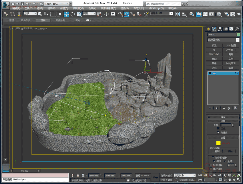 14、同樣用線在水中繪制一條魚兒游動(dòng)的路徑,并在頂視圖調(diào)整上下,形成空間感。選擇魚加一個(gè)路徑變形器-拾取路徑-轉(zhuǎn)到路徑,根據(jù)自己的模型調(diào)整變形軸。