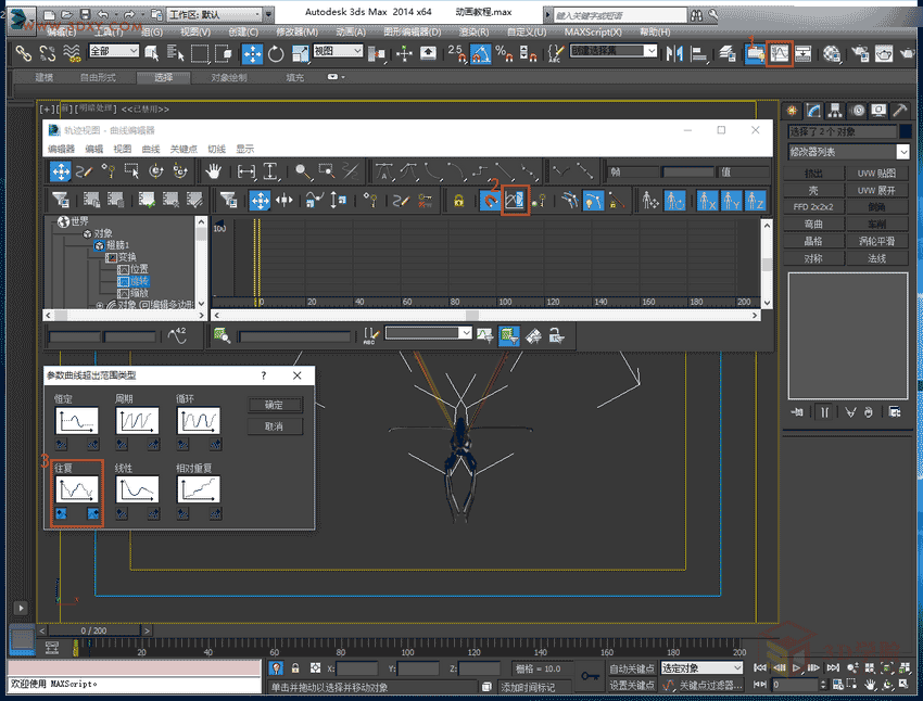 10、回到第一幀,打開曲線編輯器-參數(shù)曲線超出范圍類型-往復(fù)-確定。