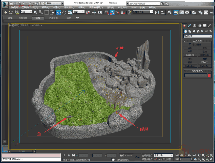 1、首先我們需要準(zhǔn)備3個(gè)模型,一個(gè)池塘、一條魚和一只蝴蝶。依次合并到max中,付好材質(zhì)。