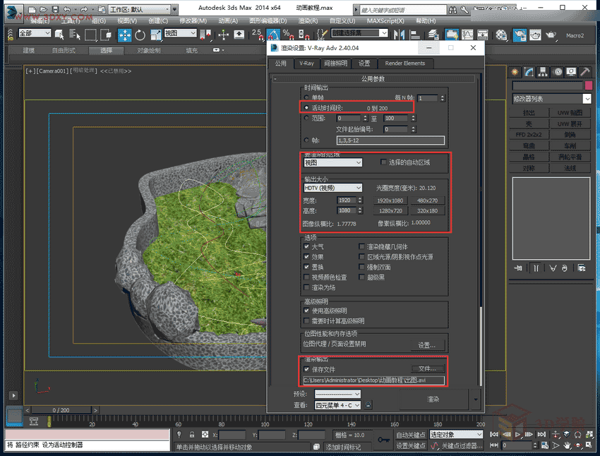 16、這時(shí),退出全部顯示,點(diǎn)擊播放按鈕,便能觀察整個(gè)動(dòng)畫的模擬過(guò)程。得到滿意的效果以后,打開渲染面板,將公用欄的參數(shù)設(shè)置如下,保存“.avi”格式,等待渲染就好了。