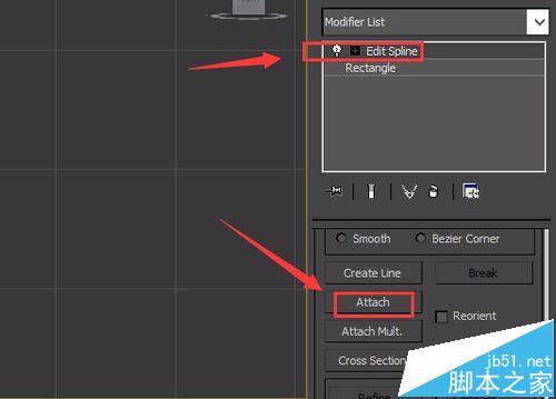 5、選擇創(chuàng)建的大的矩形,在修改器了添加edit spline編輯器,找到attach選項(xiàng),如圖所示: