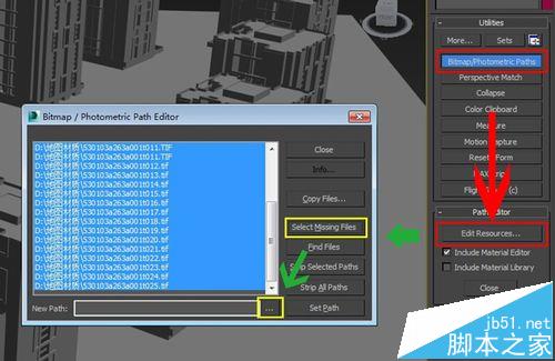 4、點擊“Bitmap/photometric paths",從出現的菜單中再次點擊”Edit Resources"激活一個菜單,點擊“SMF”測試鍵發現貼圖全部丟失了,然后點擊綠色箭頭所指的“無”