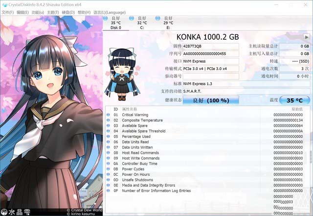 在CrystalDiskInfo中,我們可以看到康佳K580的詳細信息,接口上支持NVMe1.3協(xié)議,零寫入讀取量,零小時通電,健康狀態(tài)也是100%,表明這是一款全新出廠的固態(tài)新品。