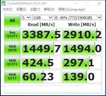 AS SDD Benchmark是比較常用的SSD讀寫測(cè)試軟件,以上成績(jī)?yōu)?GB和10GB寫入量的速度表現(xiàn),讀取速度幾乎突破3000MB/s,而寫入也維持在2600MB/s,附近。這里還要贊嘆一下它的4K讀寫速率,比小容量的同類產(chǎn)品要快不少。