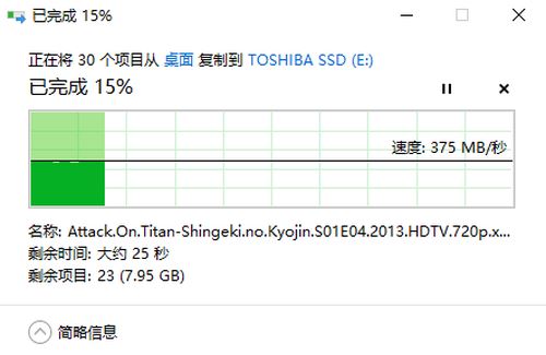 接下來,為了具體考量東芝XS700硬盤的實際讀取速度,我仍然采用同上配置的外星人電腦對其進行讀寫速度的測試,所選文件為我常用的9.35GB的視頻文件。通過測試發現,其寫入速度為375MB/s,讀取速度為409MB/s,且速度一直維持在較高水平沒有出現異常波動。9.35GB視頻文件總寫入時間約為27秒,讀取時間約為25秒。從結果來看,十分令人滿意,在以往的測試和使用體驗中,諸多品牌的諸多產品中,東芝的“性能王”當之無愧。